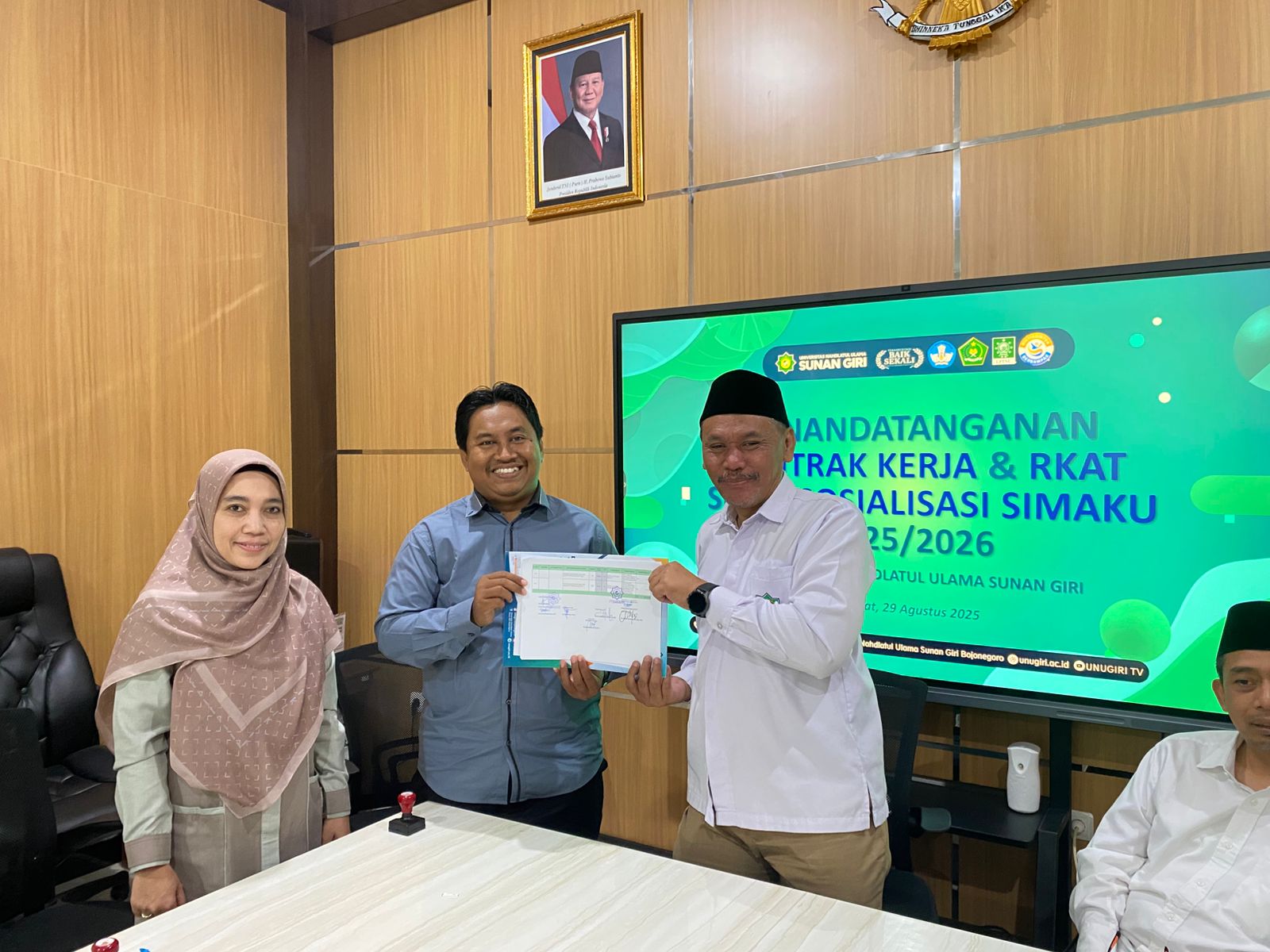 Bojonegoro, 29 Agustus 2025 – Ketua Program Studi (Kaprodi) Pendidikan Islam Anak Usia Dini (PIAUD) Universitas Nahdlatul Ulama Sunan Giri (UNUGIRI), Ahmad Farid Utsman, S.Pd.I., M.Pd.I, menghadiri dan menandatangani Kontrak Kinerja dan Rencana Kerja dan Anggaran Tahunan (RKAT) Tahun Akademik 2025-2026. Acara yang berlangsung khidmat tersebut dilaksanakan di Meeting Room Rektorat Gedung Hasyim Asy’ari Lantai 2 pada Jumat (29/8/2025).