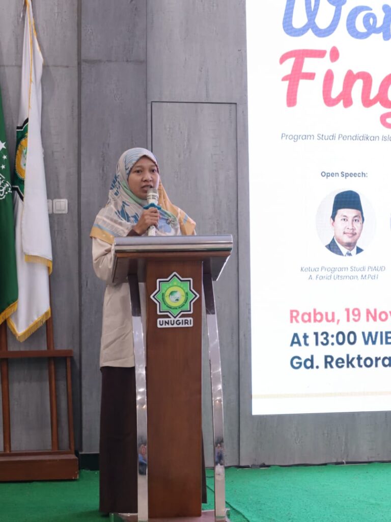 Dalam sambutannya yang membuka acara, Ibu Sekretaris Program Studi PIAUD UNUGIRI, Ibu Siti Labiba Kusna menyampaikan apresiasi dan harapan besar terhadap kegiatan ini. Beliau menekankan, “Workshop finger painting ini merupakan bagian integral dari kurikulum kami yang berfokus pada experiential learning. Kami ingin para calon pendidik PAUD tidak hanya paham teori, tetapi juga mahir dan berani bereksplorasi dengan berbagai media seni. Melalui sentuhan jari sendiri, kita belajar memahami dunia anak yang penuh dengan kejutan, imajinasi, dan warna. Saya berharap acara hari ini dapat menyalakan kembali api kreativitas dalam diri masing-masing dan menjadi bekal berharga untuk menciptakan pembelajaran yang menyenangkan bagi anak-anak kita nanti.”