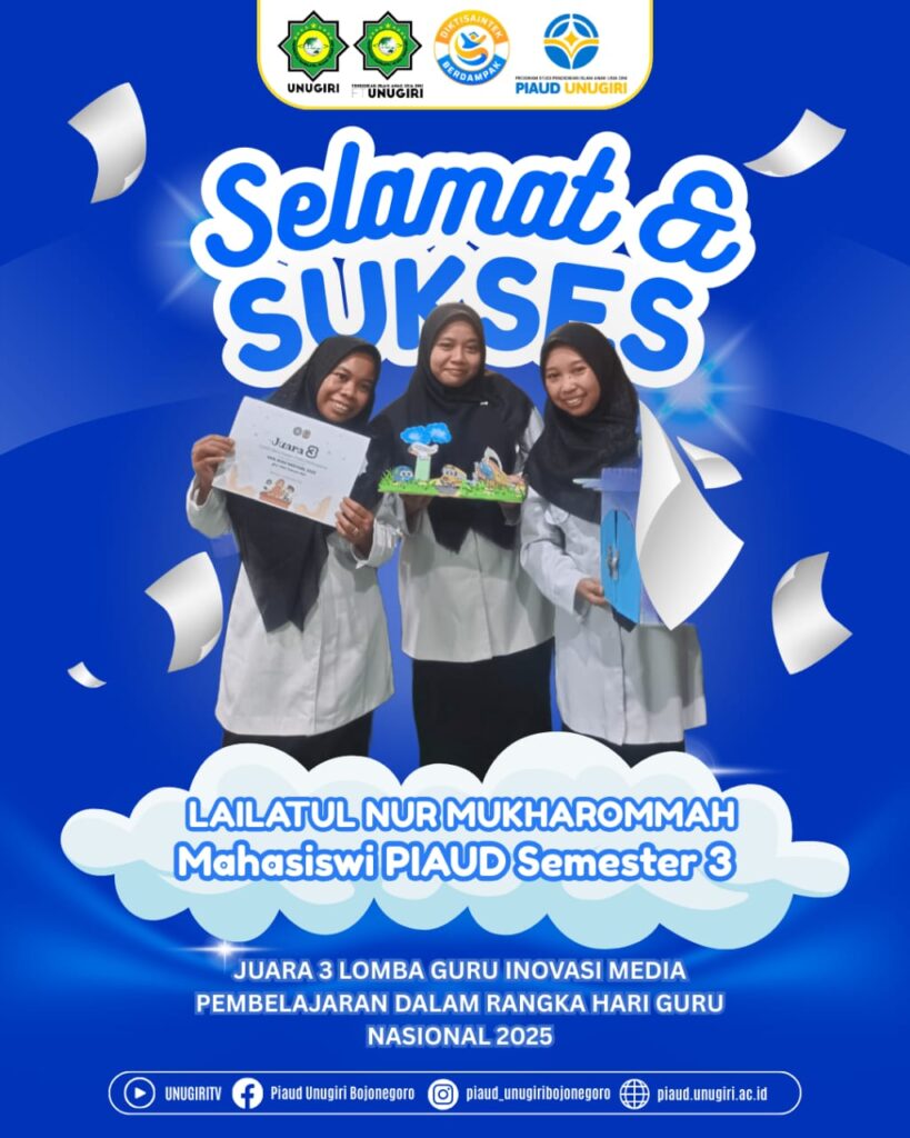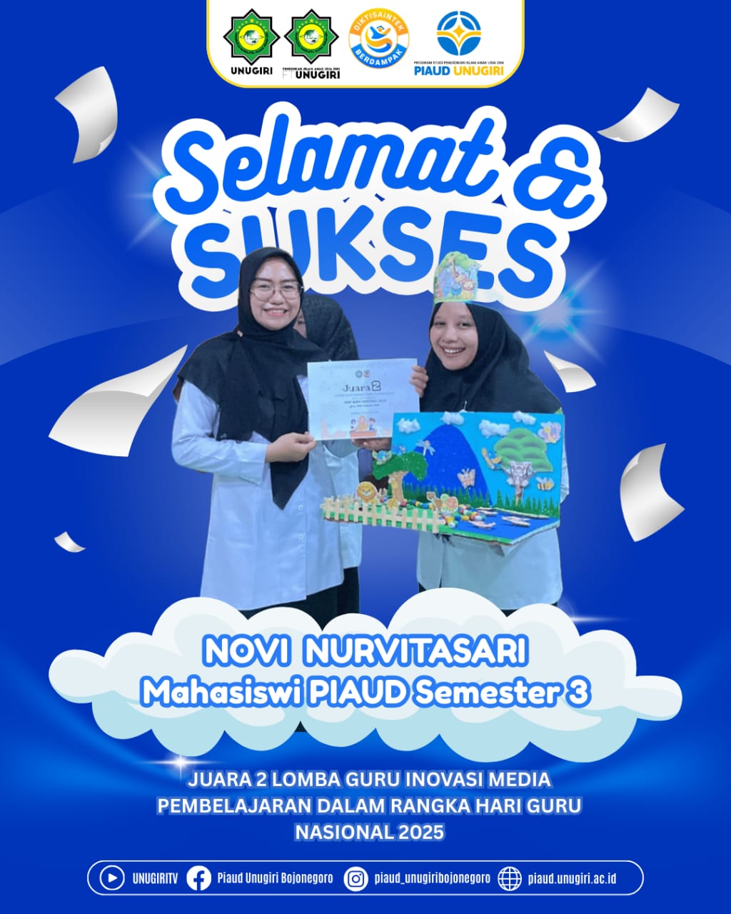 Prestasi ini tidak hanya menunjukkan dedikasi tinggi kedua mahasiswi tersebut, tetapi juga menjadi bukti nyata kualitas akademik dan kreativitas yang dikembangkan di lingkungan kampus PIAUD UNUGIRI. Keduanya bersaing dengan tenaga pendidik dari berbagai lembaga pendidikan anak usia dini se-Kabupaten Bojonegoro.