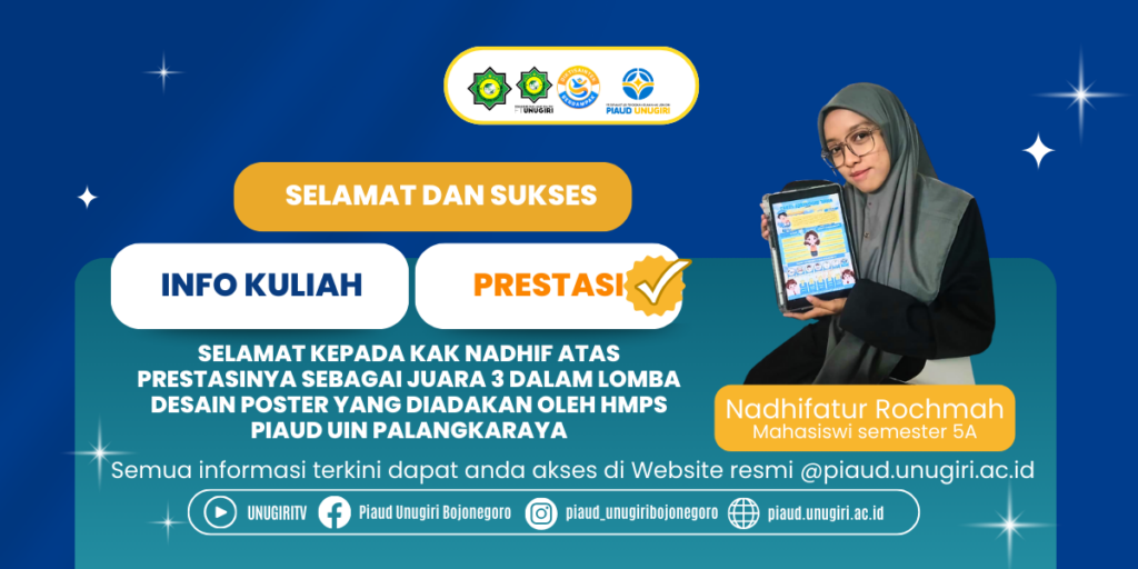 Bojonegoro, PIAUD UNUGIRI – Kabar membanggakan kembali datang dari keluarga besar Program Studi Pendidikan Islam Anak Usia Dini (PIAUD) Universitas Nahdlatul Ulama Sunan Giri (UNUGIRI) Bojonegoro. Kali ini, prestasi gemilang di kancah nasional diukir oleh mahasiswi semester 5, Nadhifatur Rochmah. Ia berhasil meraih posisi Juara 3 dalam Lomba Membuat Poster dengan tema “Anak Indonesia Hebat”, yang diselenggarakan secara nasional oleh Himpunan Mahasiswa Program Studi (HMPS) PIAUD UIN Palangkaraya.