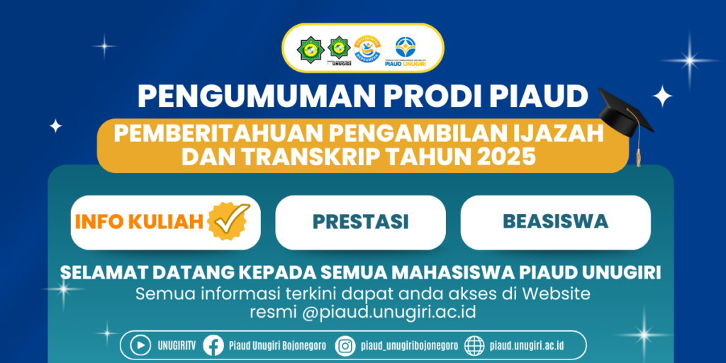 PENGUMUMAN PENGAMBILAN IJAZAH DAN TRANSKRIP NILAI 2025Untuk Mahasiswa/i PIAUD UNUGIRI kami umumkan pengambilan ijazah dan Transkrip Nilai 2025 program studi Pendidikan Islam Anak Usia Dini Fakultas Tarbiyah Unugiri