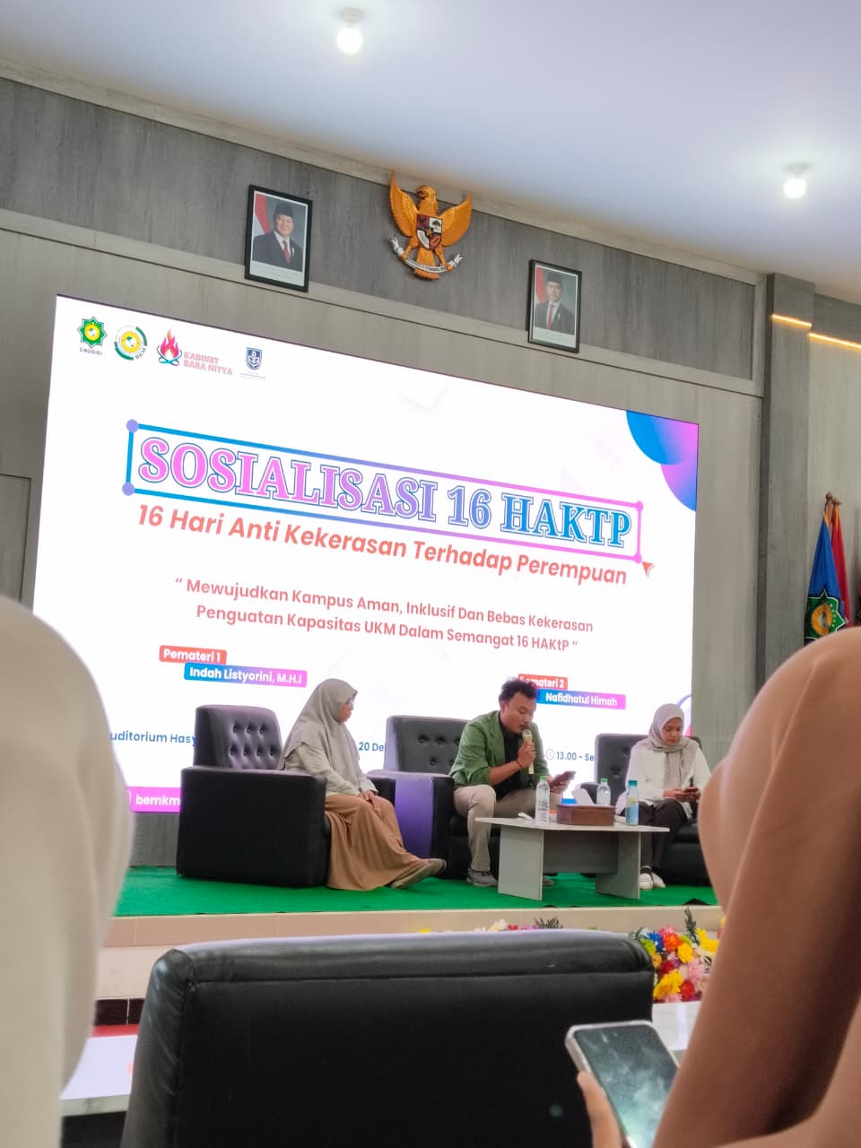 Perwakilan Himpunan Mahasiswa Program Studi (HMP) Pendidikan Islam Anak Usia Dini (PIAUD) turut serta dalam agenda Sosialisasi 16 Hari Anti Kekerasan Terhadap Perempuan (HAKTP) yang diselenggarakan oleh BEM Universitas di Auditorium Hasyim Asy’ari Lt. 3 Gedung Rektorat UNUGIRI pada 20 Desember 2025. Dengan mengusung tema “Mewujudkan Kampus Aman, Inklusif dan Bebas Kekerasan: Penguatan Kapasitas UKM Dalam Semangat 16 HAKTP”, kegiatan ini menghadirkan narasumber ahli yaitu Indah Listyorini, M.akademik Nafidhatul Himah untuk membedah urgensi perlindungan hak perempuan di lingkungan akademik.