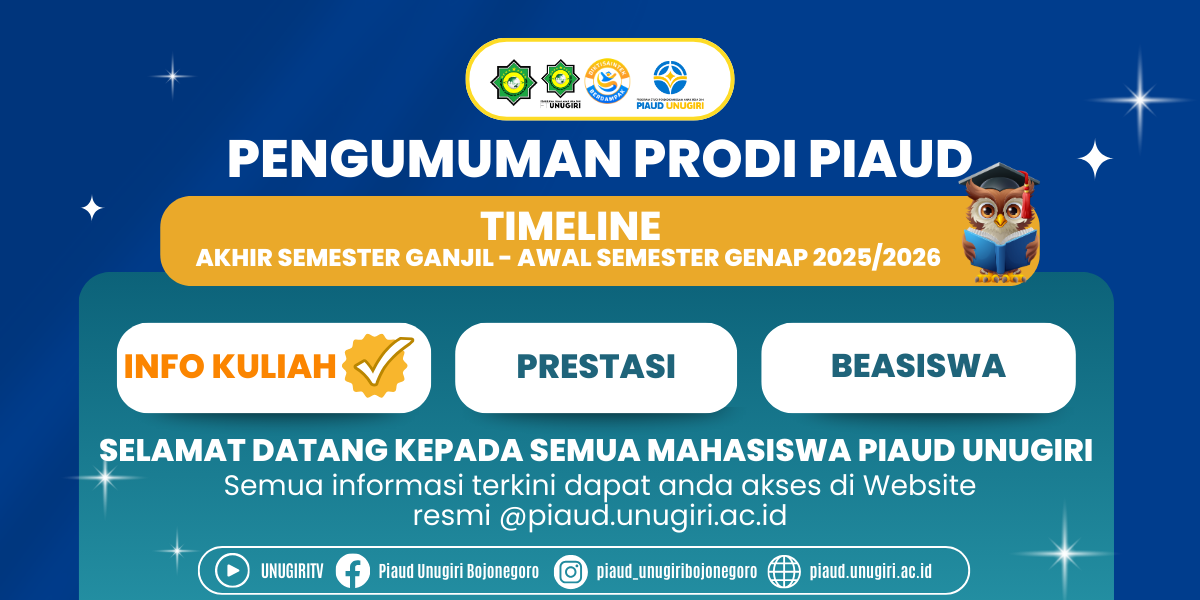 Untuk Mahasiswa/i PIAUD UNUGIRI kami beritahukan Timeline Akhir semete ganjil – awal semester tahun 2025/2026 program studi Pendidikan Islam Anak Usia Dini Fakultas Tarbiyah Unugiri